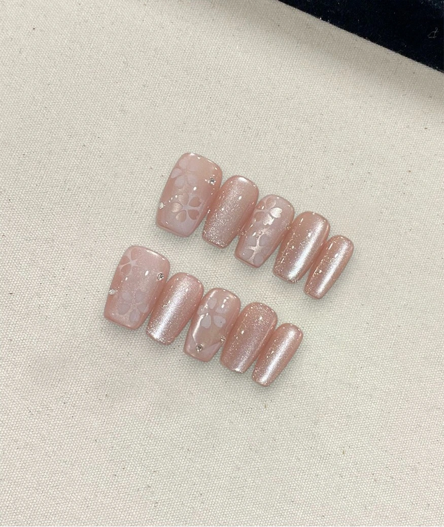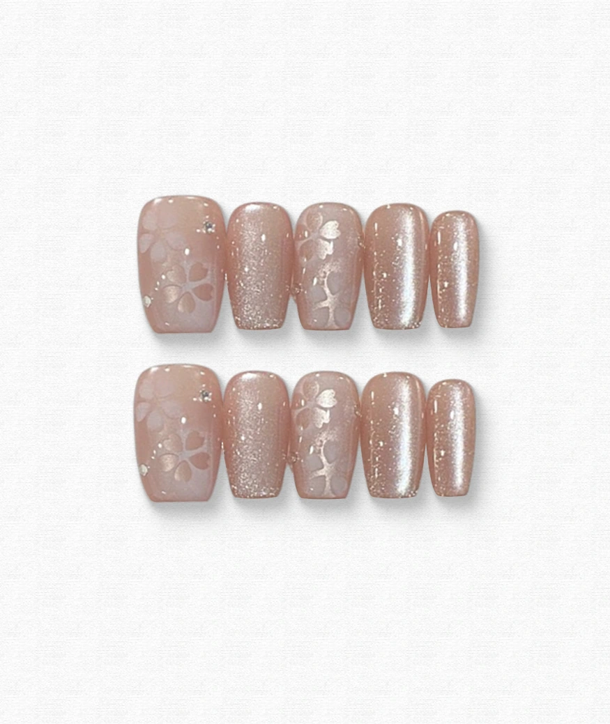 This set features a soft nude-pink base with subtle shimmer, adorned with delicate white floral patterns and tiny sparkling rhinestones. The combination of romantic blossoms and silvery glitter tips creates an effortlessly elegant look. Perfect for weddings, dates, or adding a touch of refined charm to everyday moments.
