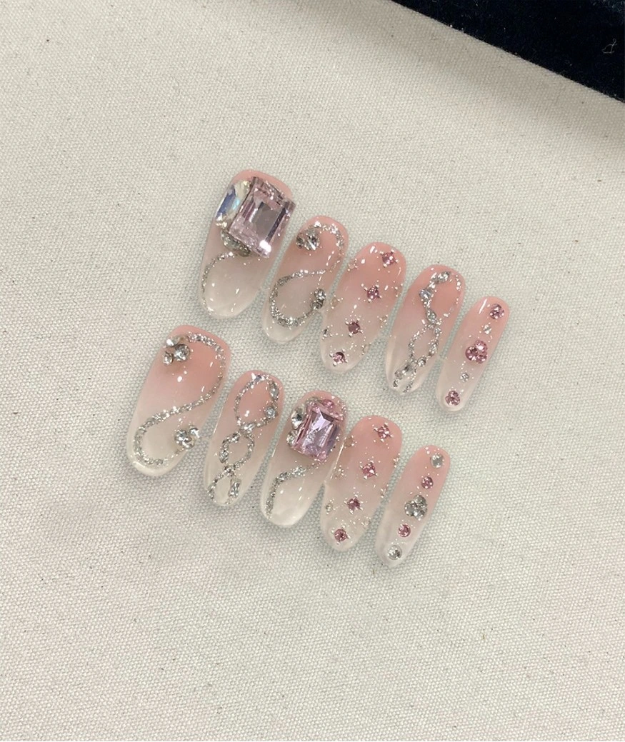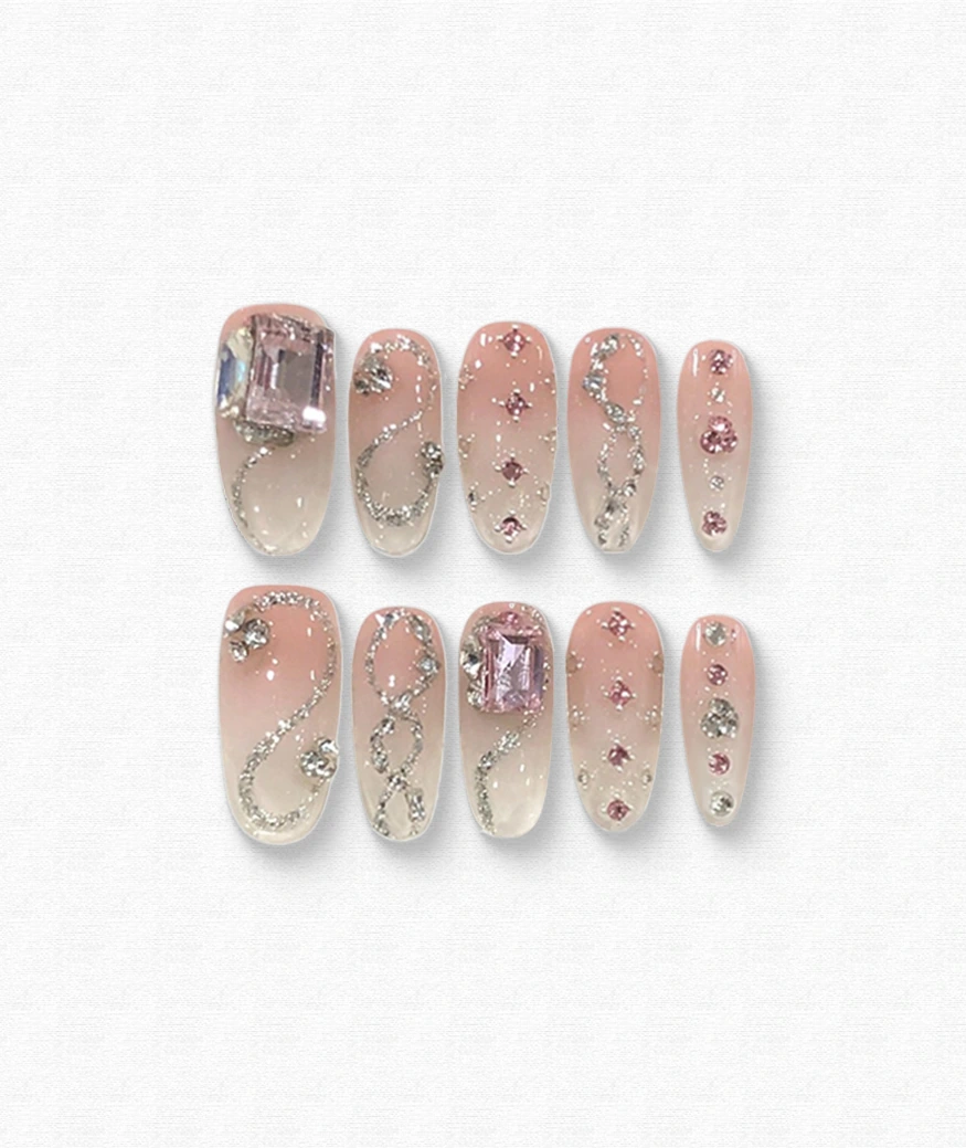 Slay the gradient game with these long almond nails dipped in a dreamy pink ombré (soft blush to sultry rose!) and decked with pink & white micro rhinestones that sparkle like morning dew. Bold pink statement stones anchor the design, while sleek silver chrome lines curve like liquid metal for edge.