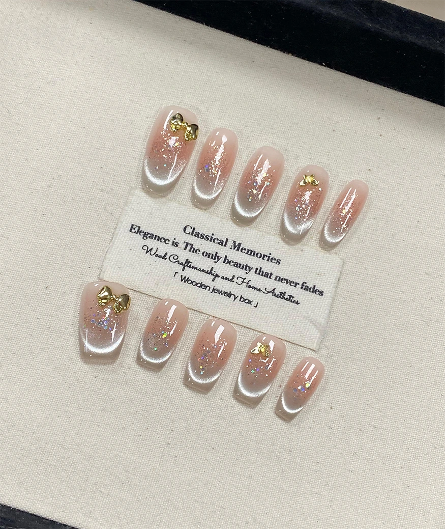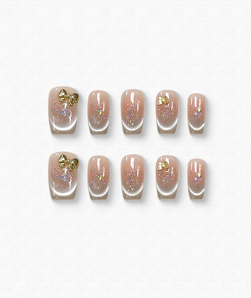 Dazzling everyday luxe! Translucent white gradient nails feature silver glitter and gold bow charms. Squared-off tips balance modernity and femininity—ideal for date nights or shopping sprees. Matte finish ensures long-lasting shine.