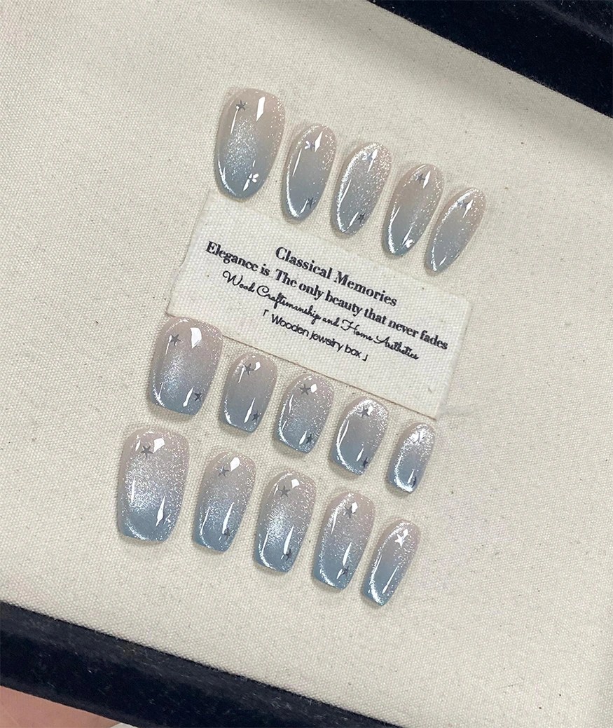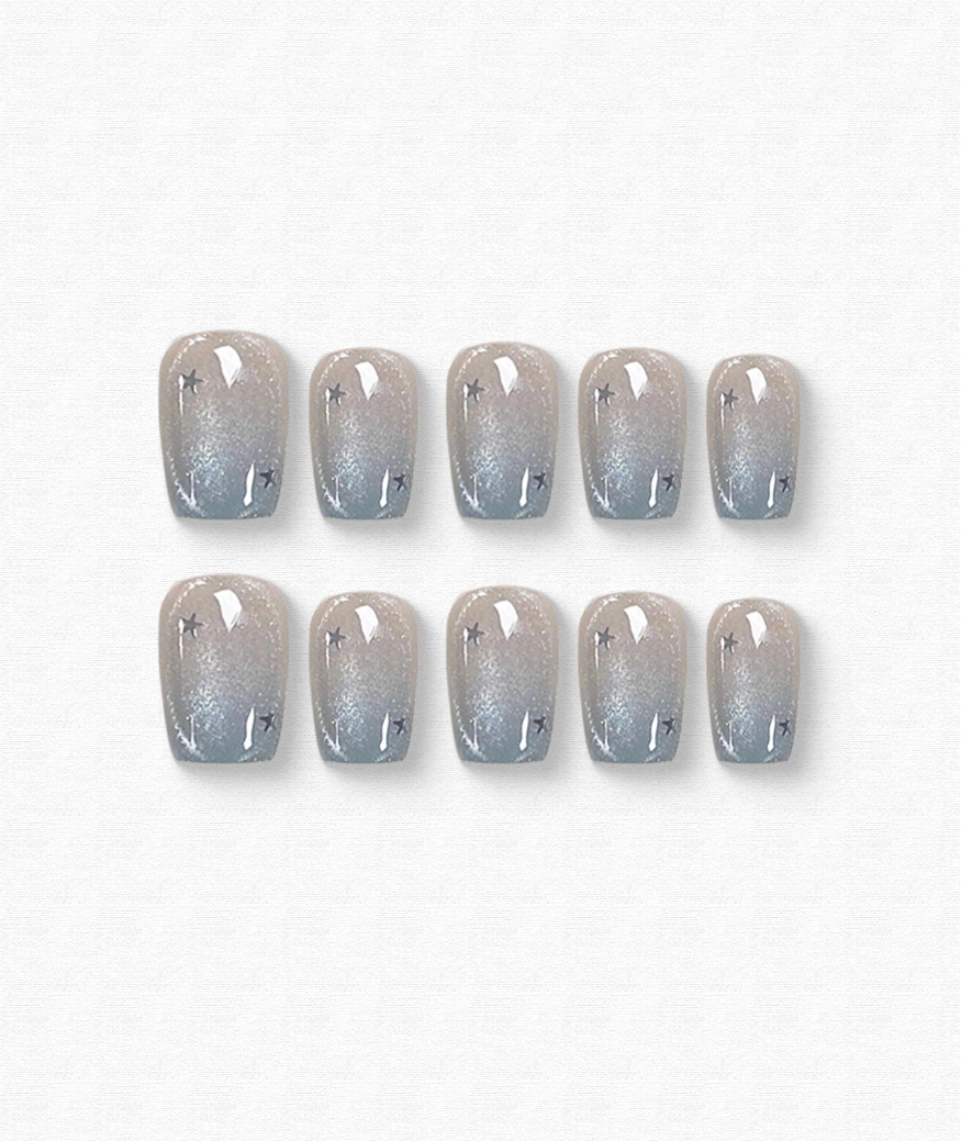 A dreamy blend of grey and shimmer, this cat-eye press-on nail set is speckled with subtle stars, evoking a quiet night sky. Perfect for those who love an understated celestial vibe. Elegant and versatile for daily wear or a starlit date night.