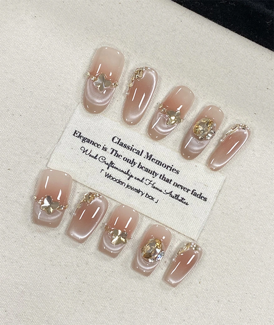 A sweet and elegant beige gradient base with butterfly-shaped rhinestones and golden embellishments. This design blends softness with sparkle for a romantic, luxurious finish.