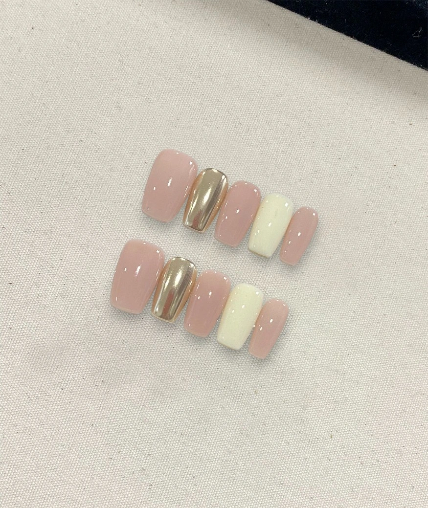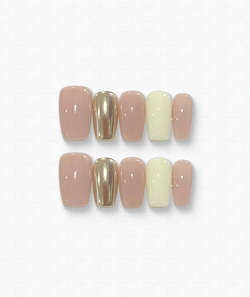 A subtle blend of warmth and glam, this nail set features blush pink, creamy yellow, and a pop of mirror-finish gold chrome. The mix of soft and bold tones makes it versatile yet eye-catching—ideal for those who want something a little different without going over the top.