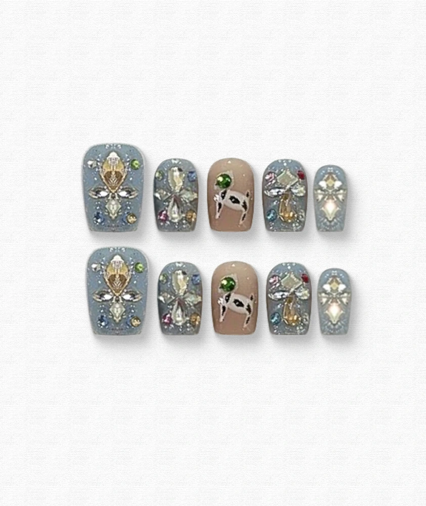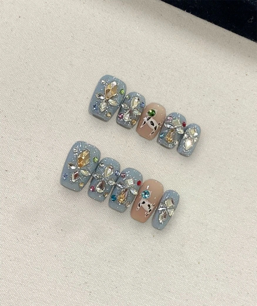 Bold and eclectic, this set showcases icy blue-gray nails adorned with multicolor rhinestones and unique hand-painted accents. The combination of sparkle and artistry makes it a statement piece for parties, festivals, or fashion-forward looks.