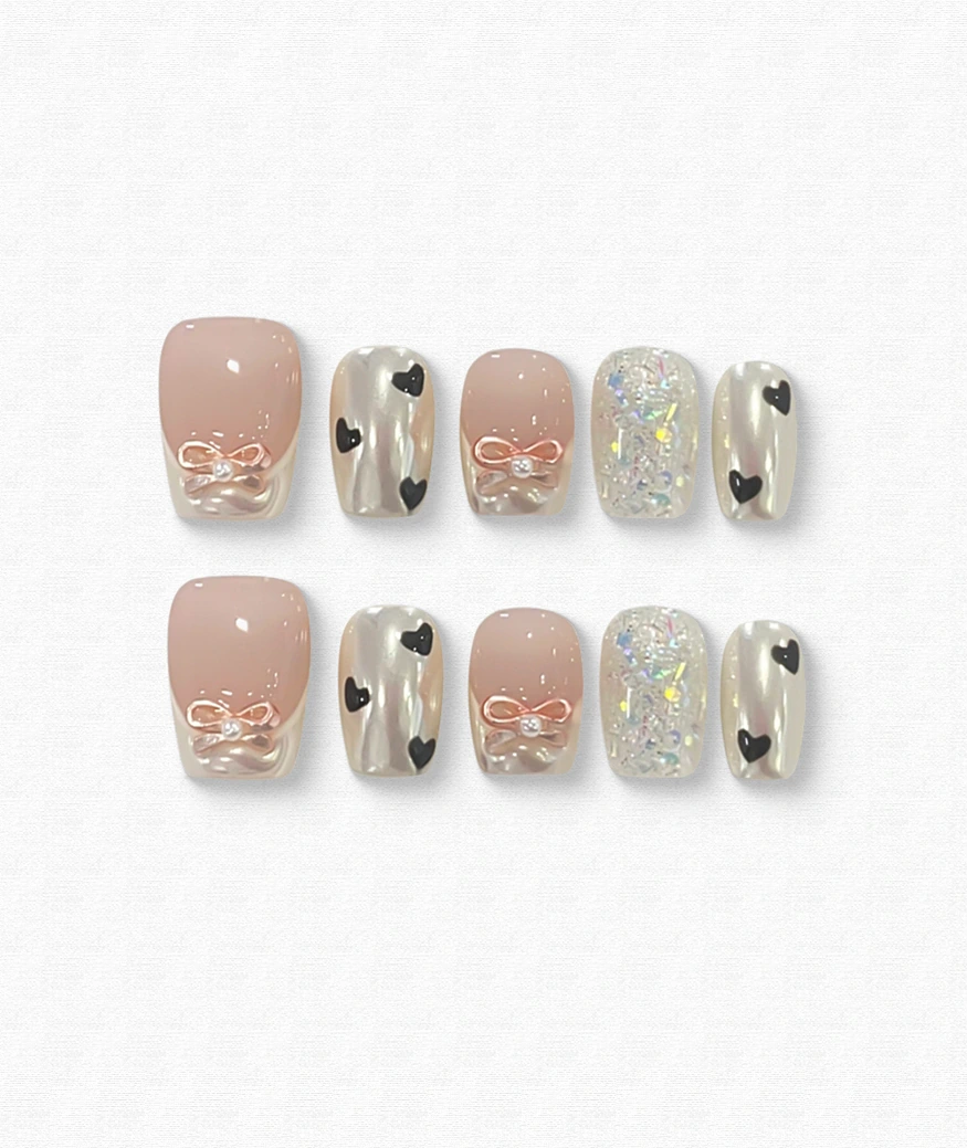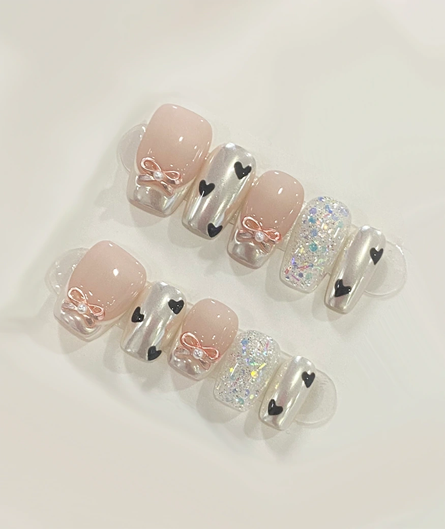 Ballet-inspired set: Nude & metallic silver nails with heart motifs, holographic chrome accents. Mixes elegance & edgy chrome style.